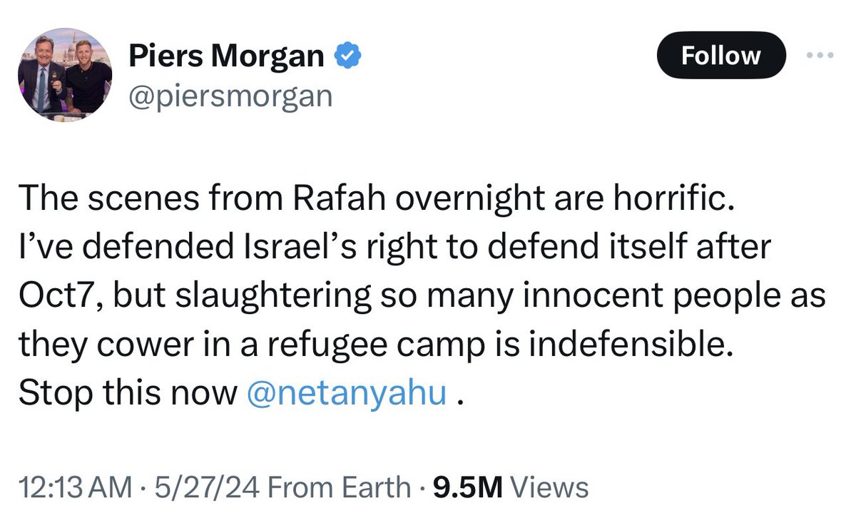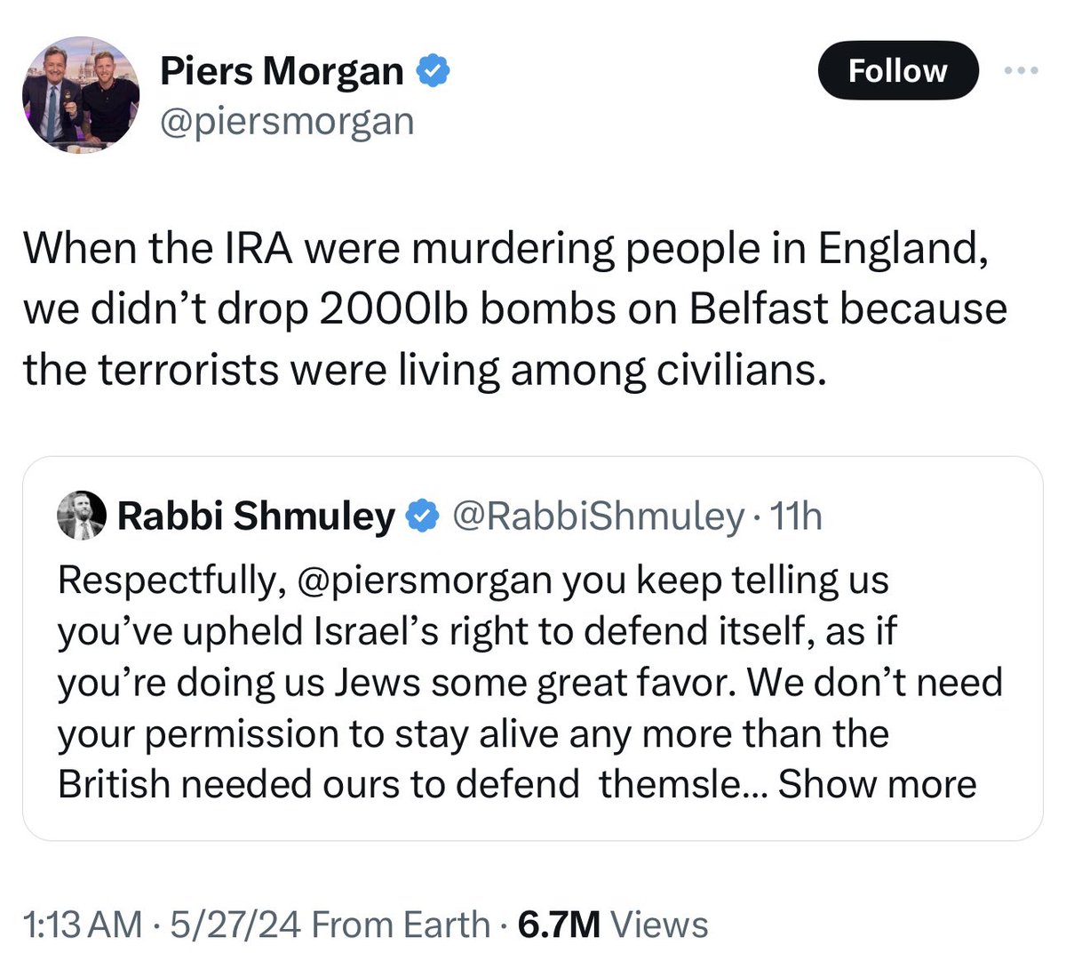 一直在为以色列辩护的英国保守派电视主播皮尔斯.摩尔根,在以色列故意违反国际法院禁制令轰炸拉法难民营后也要求停火:“爱尔兰共和军在英国杀人的时候,我们并没有因为恐怖分子生活在平民之中就用2000磅炸弹轰炸贝尔法斯特。”以色列轰炸平民无数次,他现在才明白这个道理?然后以色列朝野一起骂他。 https://t.co/qjYDf05kv4