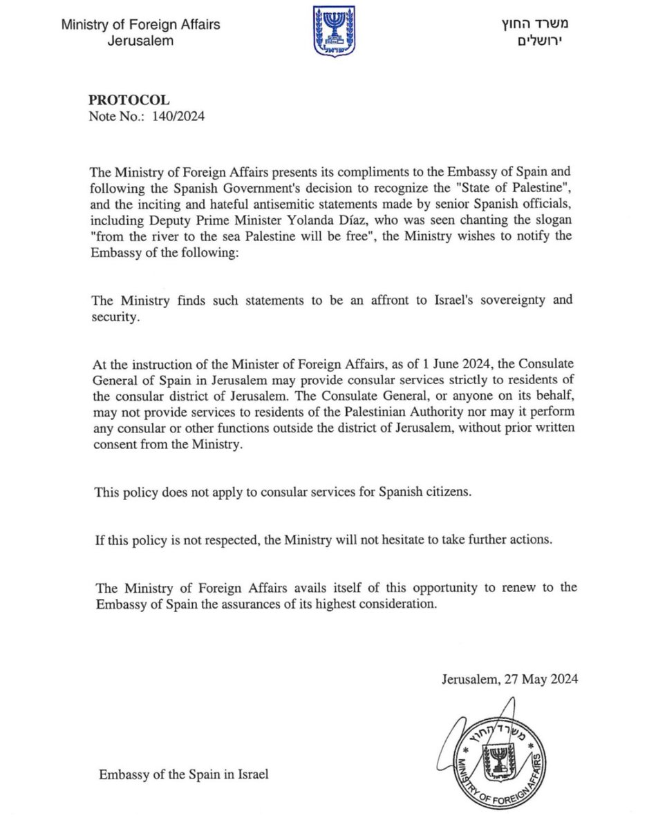 为报复西班牙承认巴勒斯坦国,以色列外交部禁止西班牙驻耶路撒冷领事馆为巴勒斯坦人提供服务。以色列政府怎么不敢关闭西班牙领事馆?怎么还要“不尊重以色列主权”的西班牙领事馆为以色列人服务?以绑架巴勒斯坦人作为报复手段,以色列政府跟土匪有何区别? https://t.co/mjIMIX62My