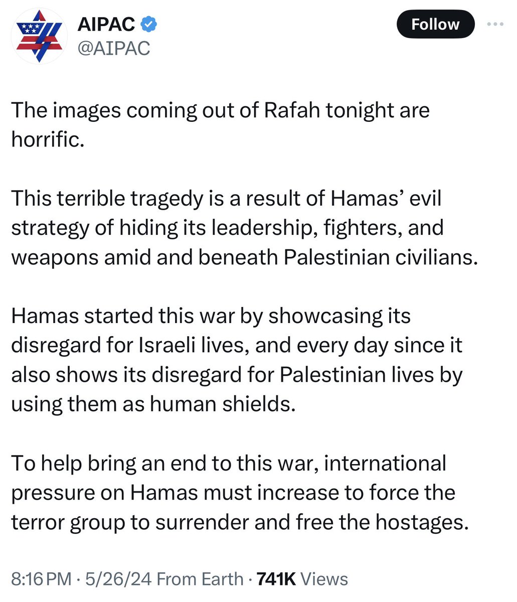 美国两党政客的金主“美国以色列公共事务委员会”说,传出来的拉法遭到轰炸的影像很恐怖,但那都是哈马斯的错。金主一声令下,美国政客就以此为以色列辩护。以色列可以放心地屠杀平民、搞种族灭绝,反正都是被哈马斯逼的。其实以前布林肯就是以这个理由为以色列辩护的。 https://t.co/B2fPNFrA8s