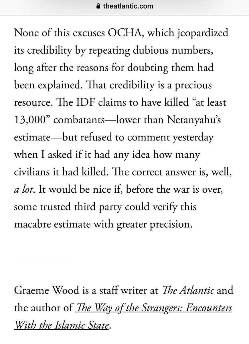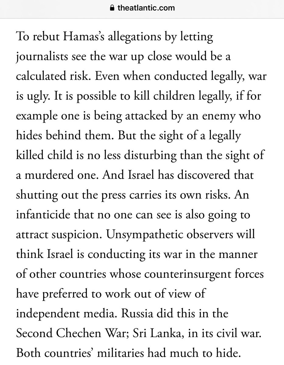 《大西洋月刊》的一篇奇文,不仅继续散布联合国减少加沙死亡人数的谎言(虽然联合国澄清没有减少),而且认为以色列可以合法地杀害儿童。《大西洋月刊》的主编是狂热支持以色列的美国犹太人,大学毕业后去以色列参军,担任关押巴勒斯坦人的军事监狱的狱卒,发这种奇文不奇怪。一份老牌名刊,至此完蛋。 https://t.co/pKmk0cEUNr