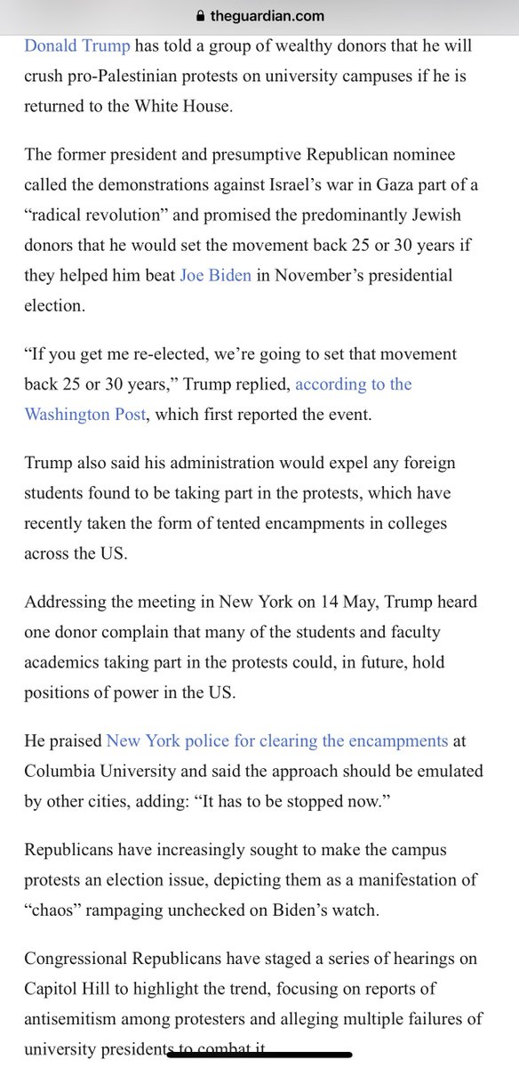 川普告诉一批捐款人,如果他当上总统,就要镇压美国大学学生运动,让学生运动倒退25或30年,还要遣返所有参加学生运动的外国学生。他真把自己当独裁者。 https://t.co/DyD4y7o5Mw