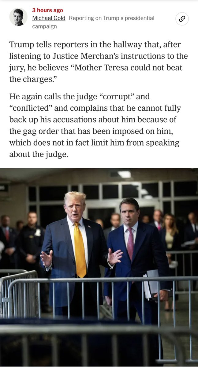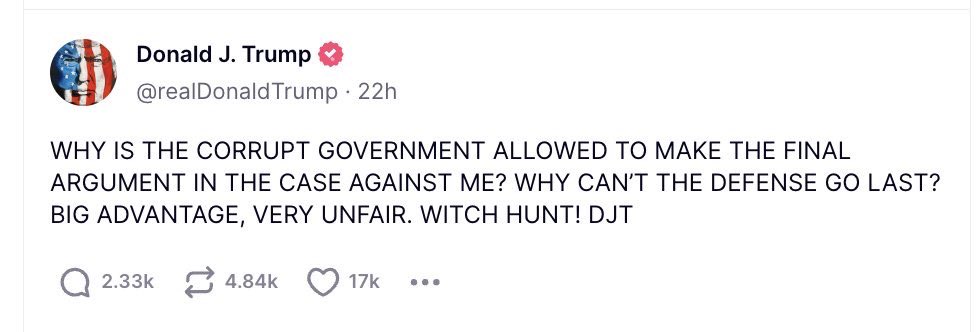 今天川普封口费案,辩护律师和检察官做最后陈词。川普说,为什么是检察官最后说?为什么不是辩护律师最后说?太不公平、太腐败了,猎巫!实际上纽约州的程序按法律规定一向就是结案陈词由辩护律师先说,检察官后说。如果是联邦案,结案陈词的顺序则是检察官总结、辩护律师总结、检察官反驳,川普岂不更要嚷嚷怎么检察官可以反驳,太不公平了!