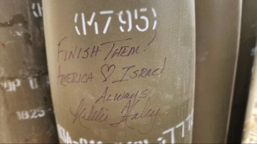 黑利访问以色列,向以色列表忠心,力挺战犯内塔尼亚胡,并在轰炸拉法的美国制造炸弹上签字:“杀光他们。美国永远爱以色列。” https://t.co/1QVbRDzffi