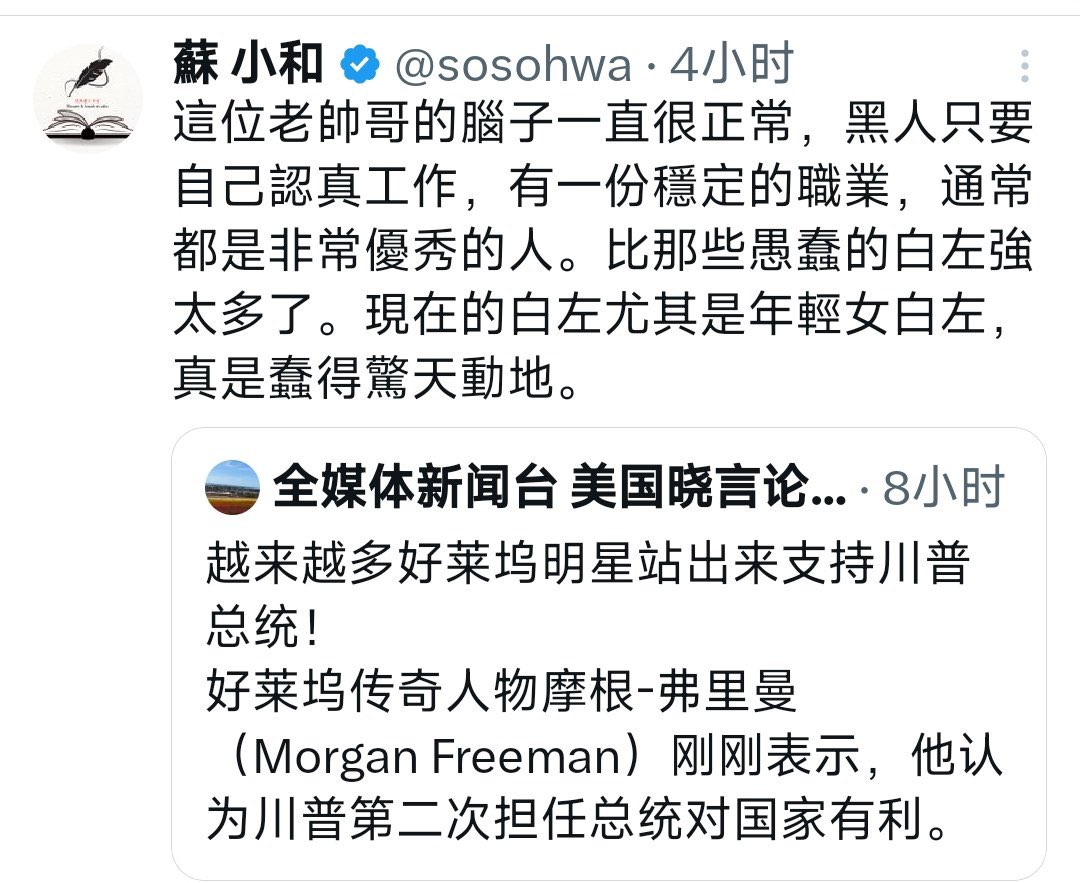川粉以为摩根.弗里曼和他们一样弱智,竟然意淫他会支持川普。实际上弗里曼和绝大多数好莱坞明星一样一向支持民主党,今年3月才出镜力挺拜登竞选总统。像苏小和这种喜欢意淫的淫秽派基督徒,才叫“蠢得惊天动地”。 https://t.co/aVJ2GAQylY