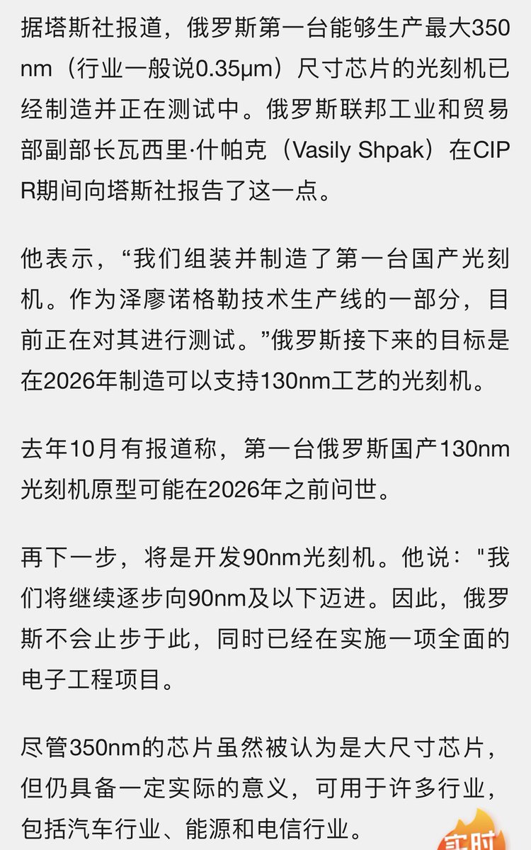 厉害,俄国终于制造出了第一台国产光刻机,能生产350纳米芯片呢,是台积电2纳米芯片的170倍,牛吧。 https://t.co/Wv4esd3w2J