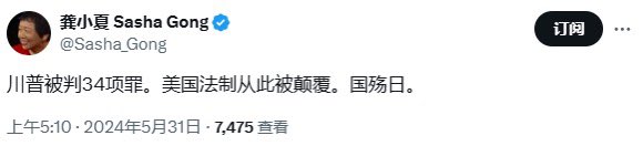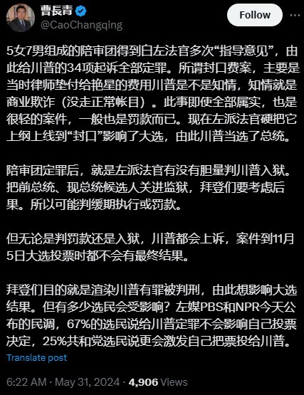 纽约陪审团没有混进川粉,12名陪审员一致判决川普34项罪名成立。川普的辩护律师立即提出动议要求法官推翻陪审团判决判川普无罪,被法官驳回。川普出了法庭又大骂法官腐败。法官定于7月11日判刑,因为是最低级重罪、初犯、老人、前总统,不太可能真判他坐牢。无论如何,川普成了美国第一个重罪犯前总统,还可能成为重罪犯当总统。 https://video.twimg.com/amplify_video/1796301803895840768/vid/avc1/722x720/63pZ19VEDeVKnlL3.mp4?tag=16