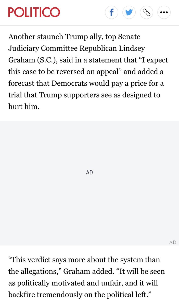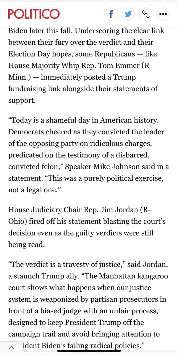 共和党大佬们立即跳出来抨击川普被定罪是美国之耻,骂纽约法院是野鸡法院。这些效忠川普的政客,认为川普有凌驾法律之上的特权,不要法治要人治,不信任美国司法制度,才是美国之耻。共和党已成川普党,几乎所有的共和党选民都表示川普被定罪只会让他们更加支持川普,不影响选他。会受影响的是中间选民 https://t.co/v2c8glp737