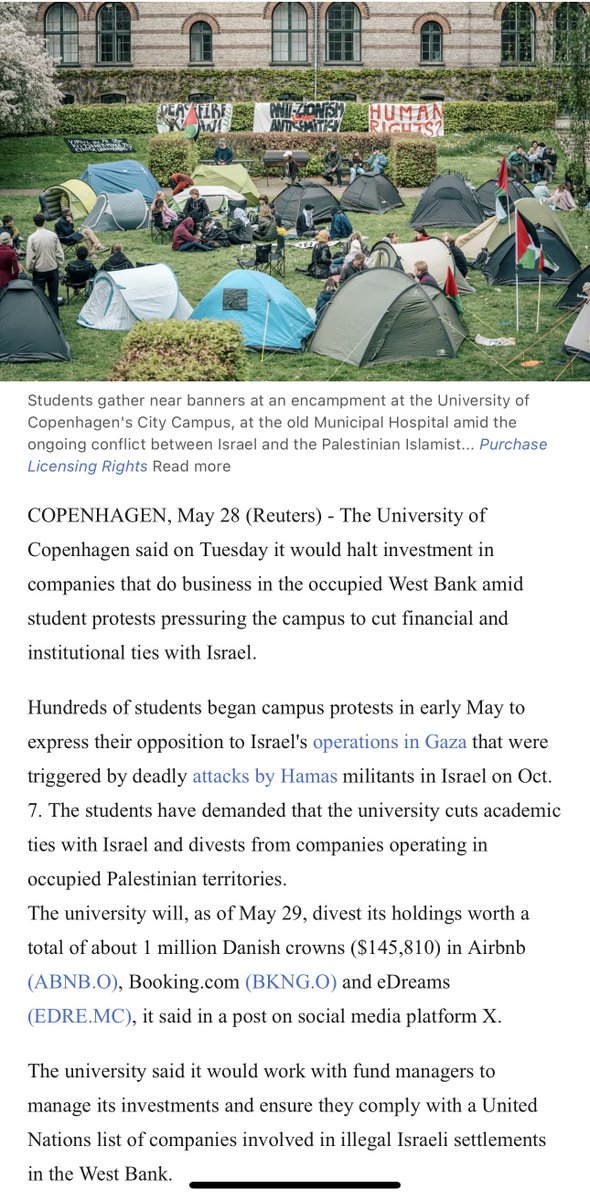 哥本哈根大学与扎营抗议学生达成协议,将从那些与约旦河西岸被占领土犹太殖民者有生意的公司撤资,包括Airbnb,https://t.co/yBKRYdKfOK和eDreams。 https://t.co/cPwvVMAJkK