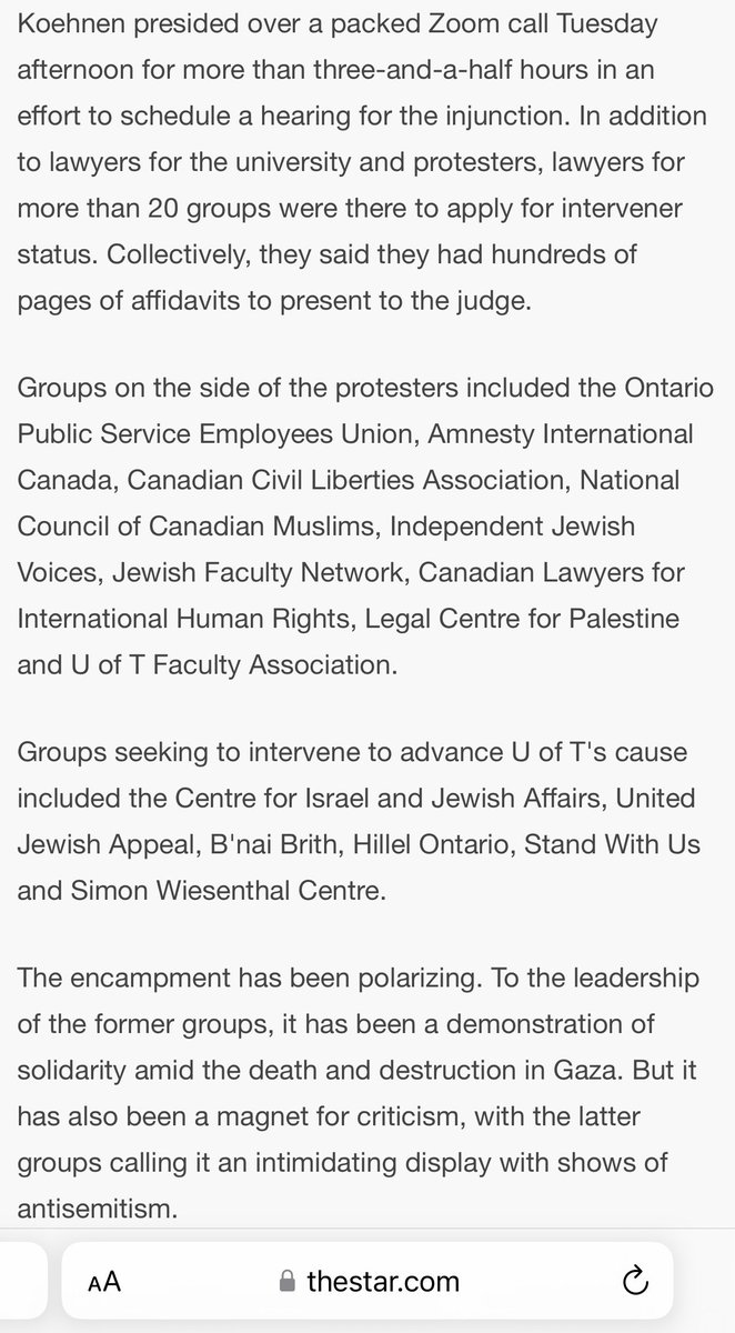 多伦多大学向法院申请禁制令,要求叫警察到校园清除学生抗议营地。多个团体向法院提交证词反对或支持禁制令。支持抗议者的团体包括安大略公共服务雇员工会、大赦国际、加拿大民权联盟、加拿大穆斯林全国委员会、独立犹太人之声、犹太教师网络、加拿大国际人权律师、支持巴勒斯坦法律中心和多伦多大学教师协会。支持校方的团体则全是犹太人组织,全世界都在逆行。