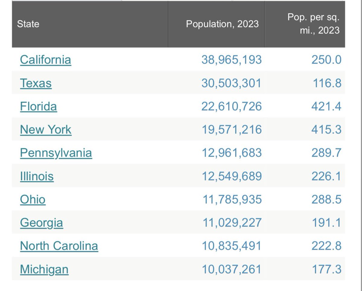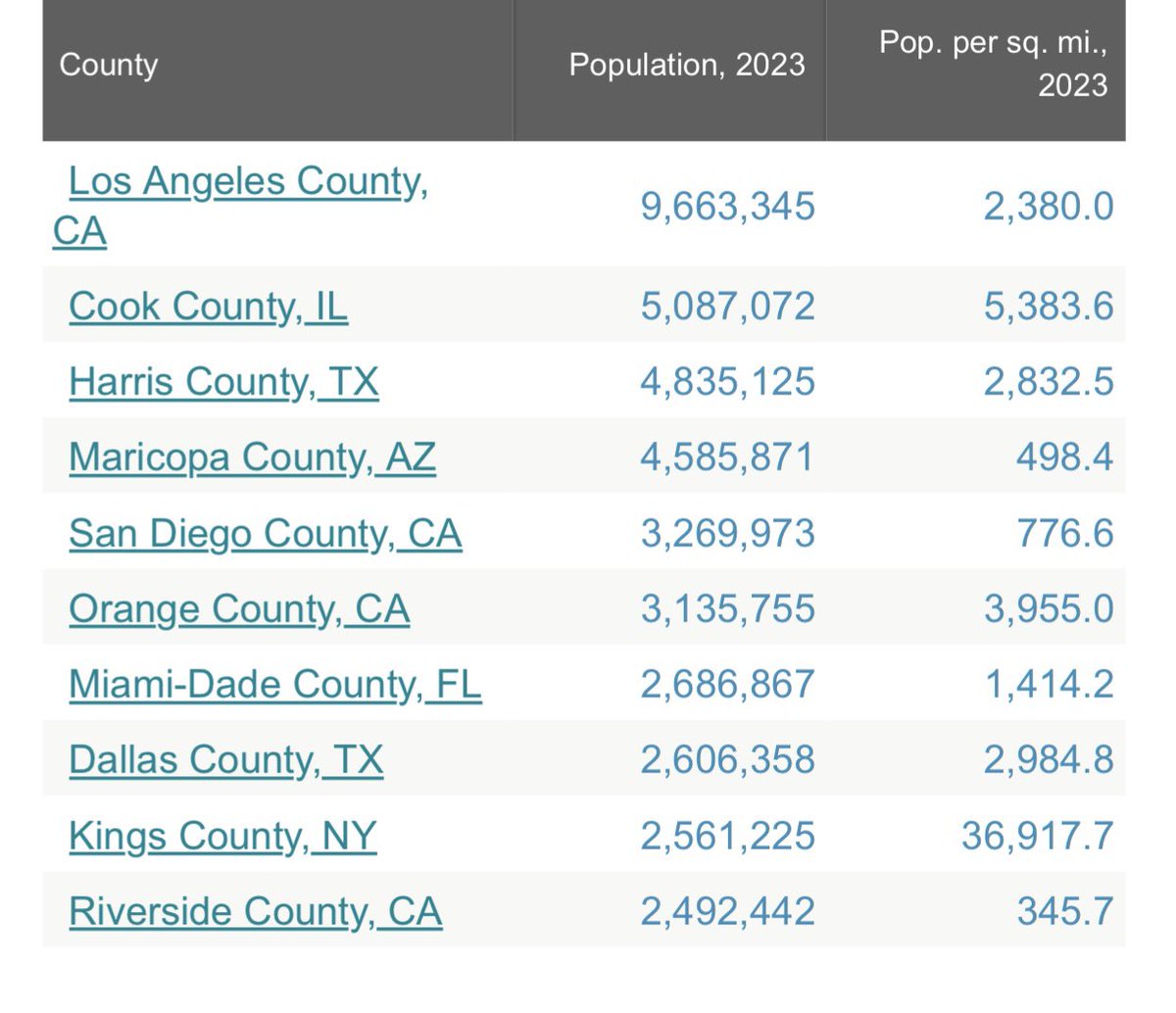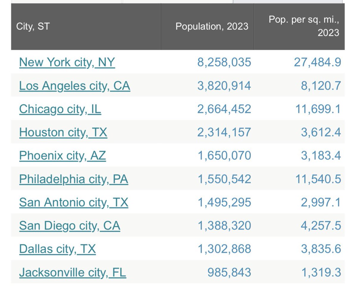 美国十大州:加州、得州、佛州、纽约、宾州、伊利诺、俄亥俄、佐治亚、北卡、密歇根。十大郡:洛杉矶郡、库克郡、哈里斯郡、马里科帕郡、圣地亚哥郡、橙郡、迈阿密-戴德郡、达拉斯郡、金斯郡、河滨郡。十大市:纽约、洛杉矶、芝加哥、休斯敦、凤凰城、费城、圣安东尼奥、圣地亚哥、达拉斯、杰克逊维尔 https://t.co/LQOq4pKT3X