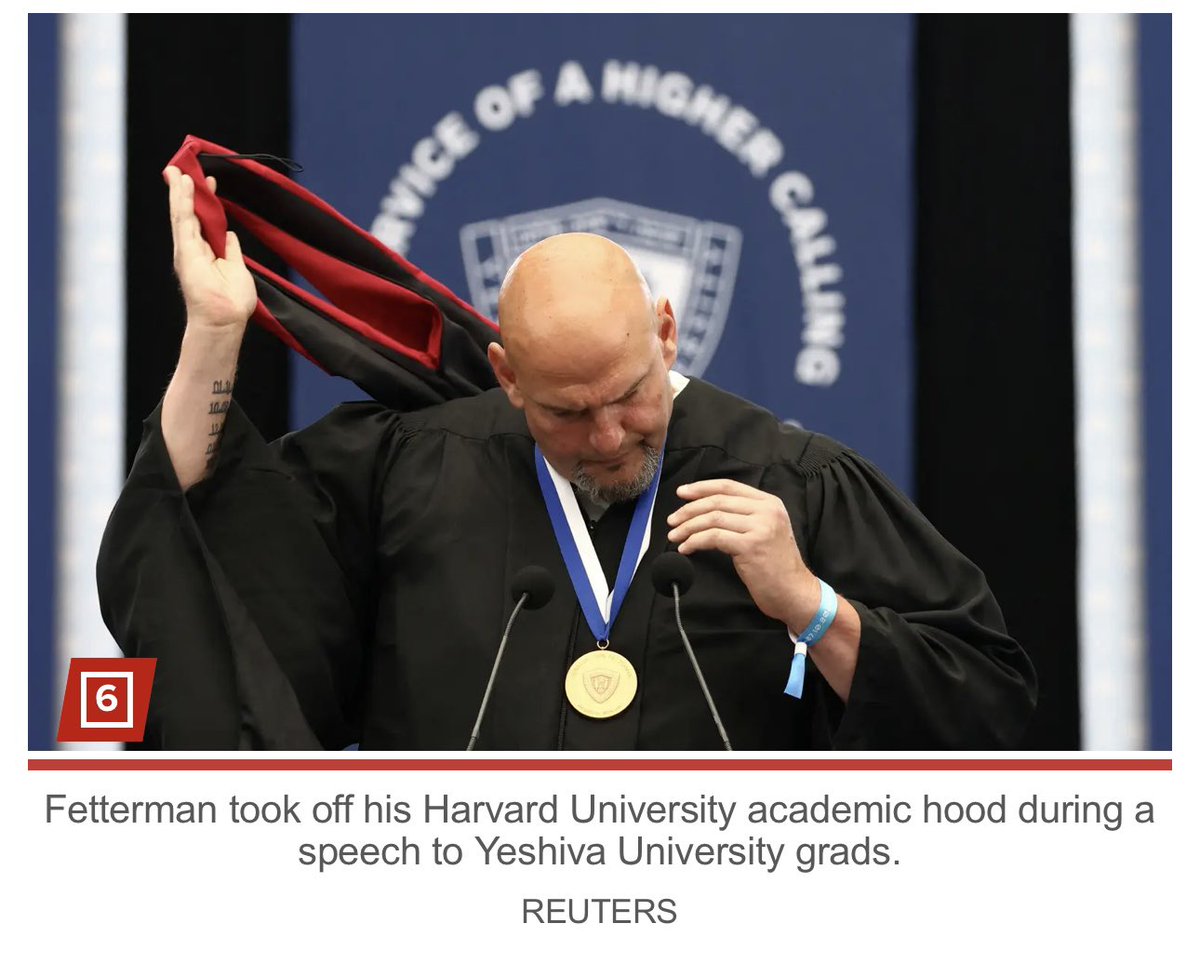 代表宾州的参议员菲特曼,去纽约犹太学校耶希法大学接受“以色列英雄”奖章,为了向以色列表忠心和表示对哈佛“反犹主义”的不满,摘下哈佛学位帽。他在哈佛拿的是在职读的不值钱的MPP(公共政策硕士),不如放弃更显得对以色列忠心耿耿。民主党参议员中最令人恶心的就是这个人,完全是个骗子。 https://t.co/6SRzBhqzuM