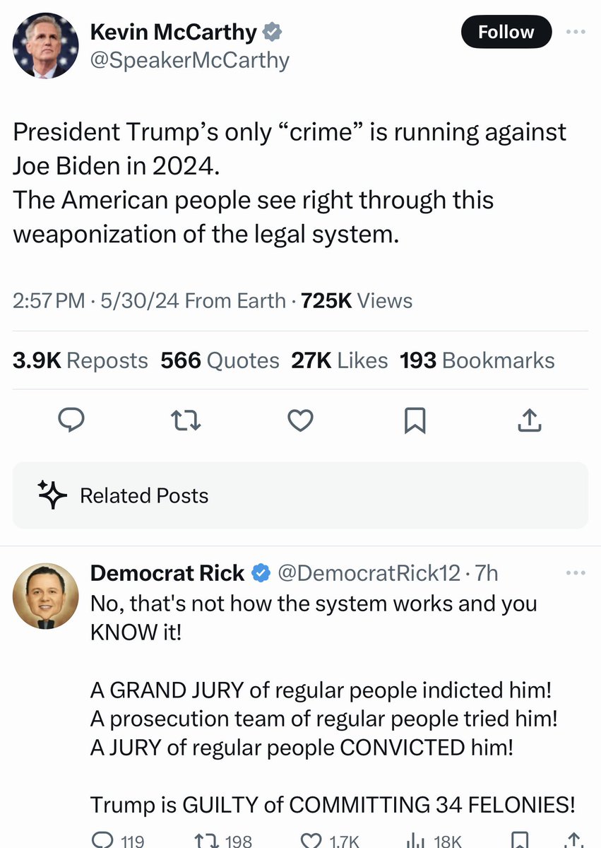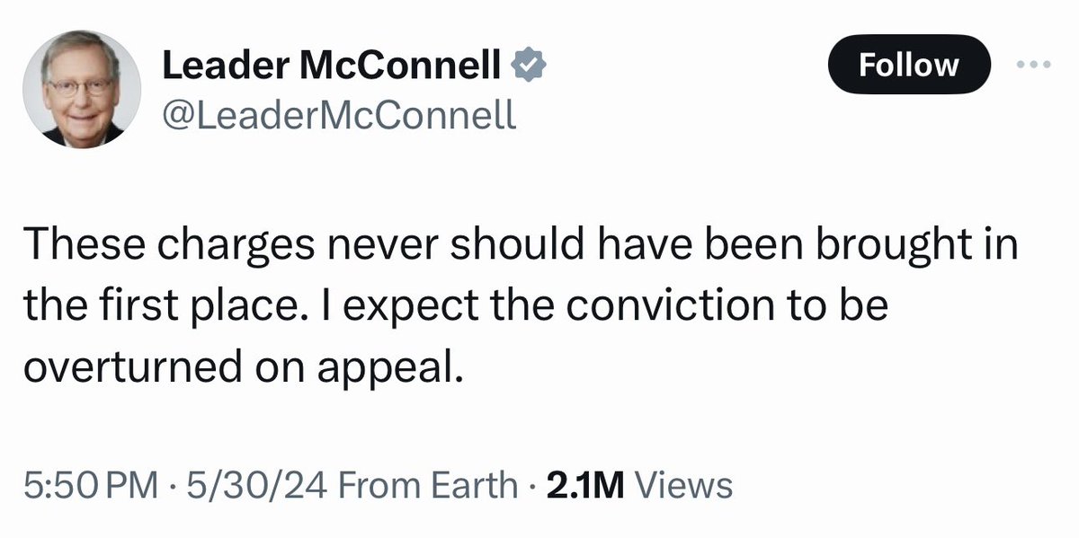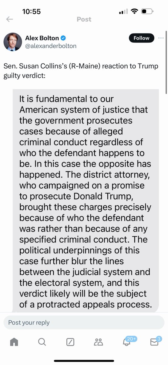 麦康奈尔、麦卡锡也都出来向川普表忠心。被称为“温和派共和党”的柯林斯参议员也认为川普有凌驾于法律之上的特权。现在哪有“温和派共和党”?这些共和党议员表现出来的法律素养连纽约普通市民都不如,当然都是装的,如果是民主党政客被定罪,他们就个个成了法学家了。 https://t.co/1J1VEbA1O5