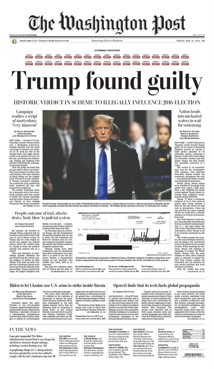 这个川粉的智商满70了吗?对美国前总统被定罪这么重大的新闻,他想要媒体低调报道?或者报道“无罪”?岂止美国媒体,国外媒体也大都头版头条报道川普有罪(中国官媒例外,头版头条一定是习主席),甚至连法轮功的媒体也很不情愿地用小篇幅头版头条报道,川粉是不是要说全世界媒体都被控制了? https://t.co/0zmCs3xvuE