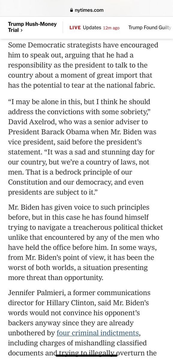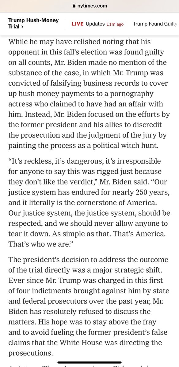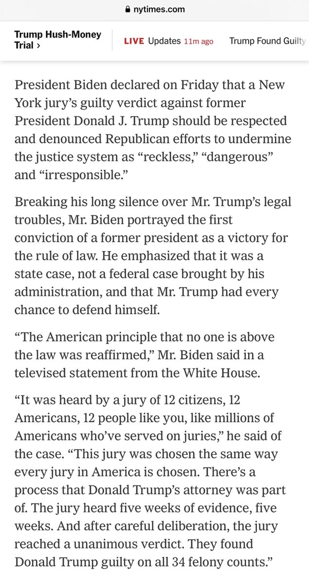 拜登终于打破沉默评论川普被定罪,这是对的,不能为了避嫌就听任共和党政客破坏美国法治、散布对美国司法制度的不信任。作为总统,有维护美国司法尊严和司法独立的义务。共和党现在就是一个崇拜川普的反美邪教,不喜欢审案结果就大骂美国司法腐败,正如不接受投票结果就大骂美国选举舞弊。 https://t.co/WHn5uSmpqU