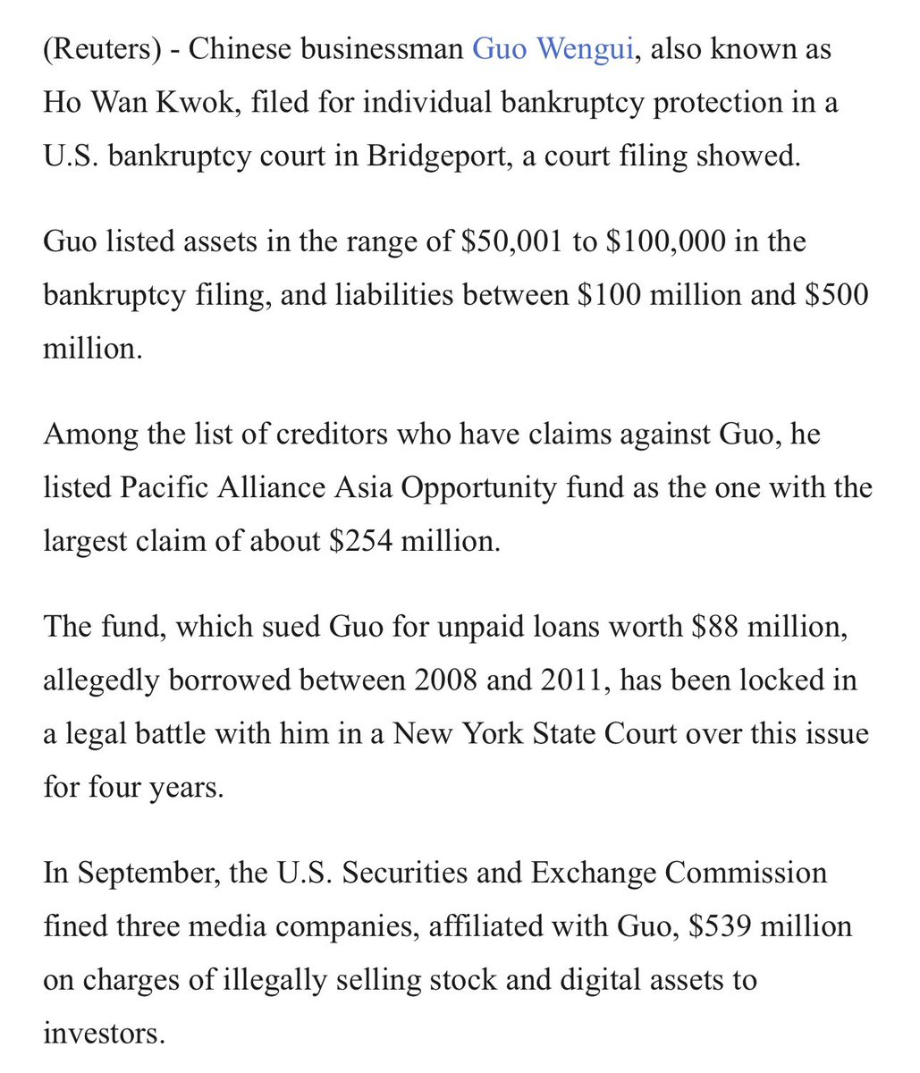 郭文贵又申请破产了,说他财产只剩下5万到10万美元,欠债1亿到5亿美元。喜国要灭国了吗? https://t.co/qEOflxf1i7
