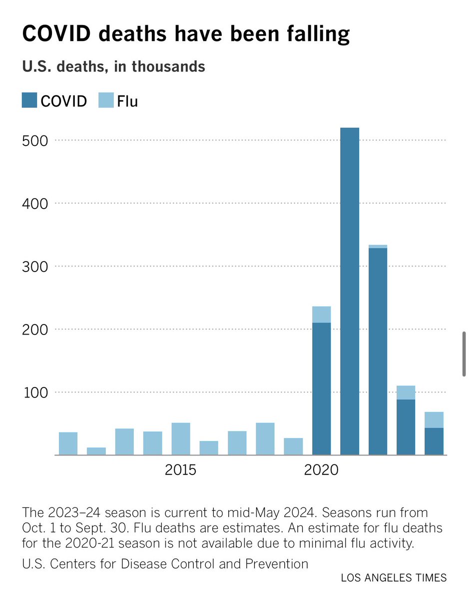 2010年以来美国历年死于流感、新冠的人数。现在死于新冠的人数还是比流感多一些。 https://t.co/yJ91hLl9bG