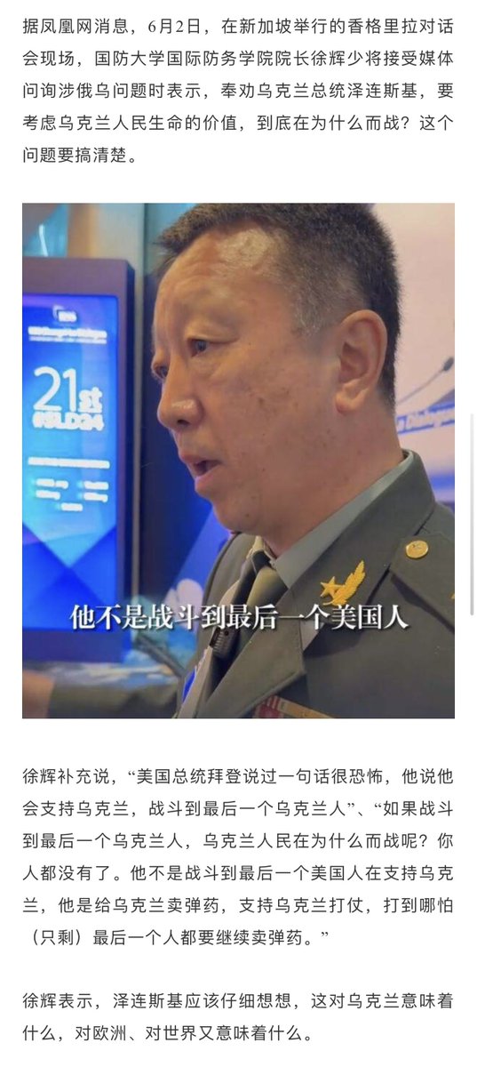 “徐辉少将喊话泽连斯基:要考虑乌克兰人民生命的价值”:中国出这种劝人向侵略者投降保命的将军,中国之耻。设想一下:汪精卫政权的将军喊话蒋介石,要考虑到中国人民的生命价值,赶快投降保命。 https://t.co/LThgnBvTNY