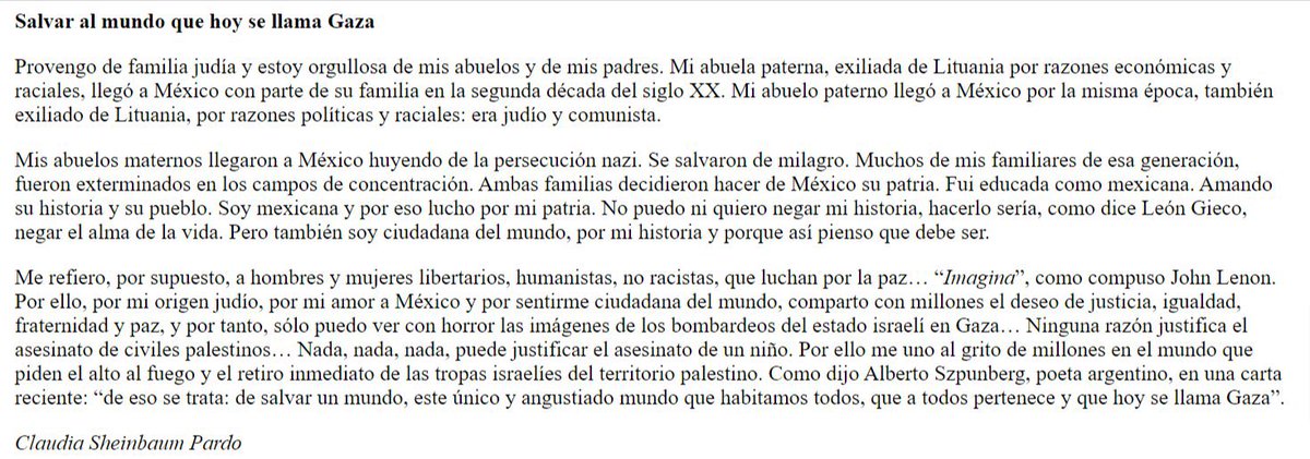 墨西哥当选总统辛鲍姆是有犹太人血统的无神论者、社会主义者。2009年她还是大学教授时曾致函墨西哥《每日新闻》谴责以色列轰炸加沙:“由于我的犹太血统,由于我对墨西哥的热爱,由于我觉得自己是世界公民,我与数百万人一样渴望正义、平等、博爱与和平,因此,看到国家轰炸的画面我只能感到恐惧。”“没有任何理由可以为杀害巴勒斯坦平民开脱。没有、没有、没有任何理由可以为杀害儿童开脱。因此,我与全世界数百万人一道呼吁停火并要求以色列军队立即撤出巴勒斯坦领土。”