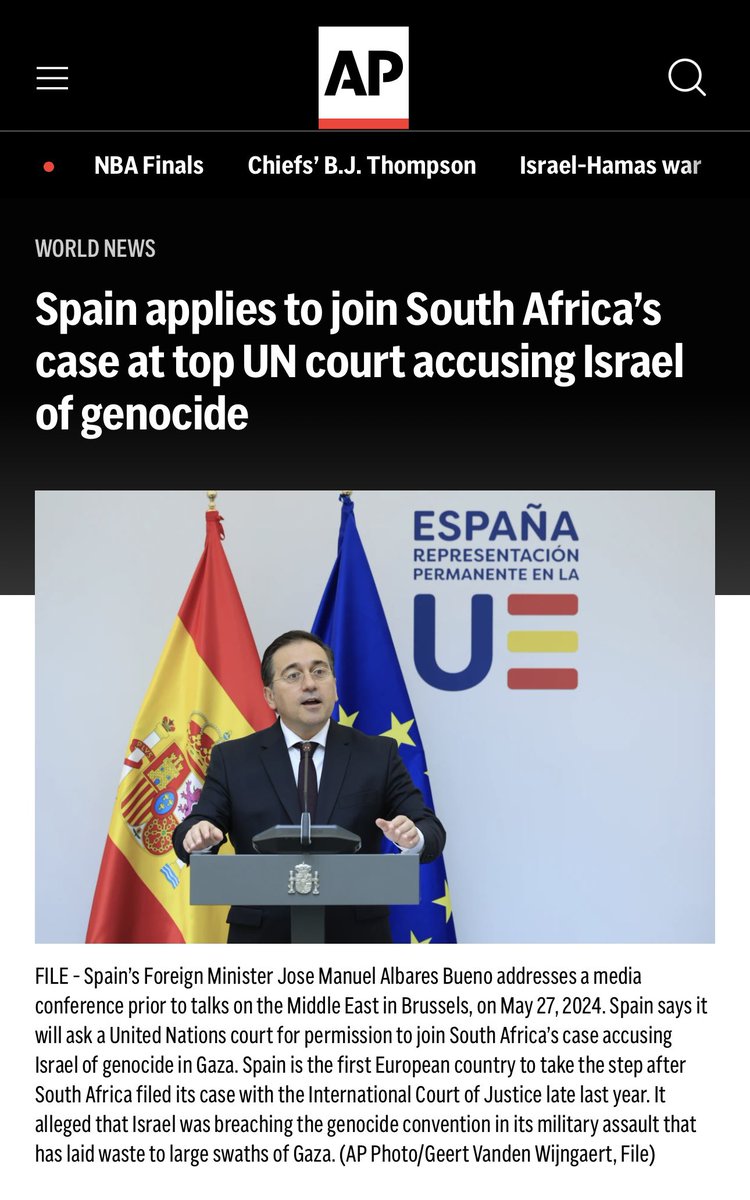 西班牙向国际法院申请加入南非起诉以色列种族灭绝的案子。看以色列有没有种与西班牙断交。去年国际法院允许西班牙等32个国家加入乌克兰起诉俄国种族灭绝的案子。 https://t.co/q6150gsMmU
