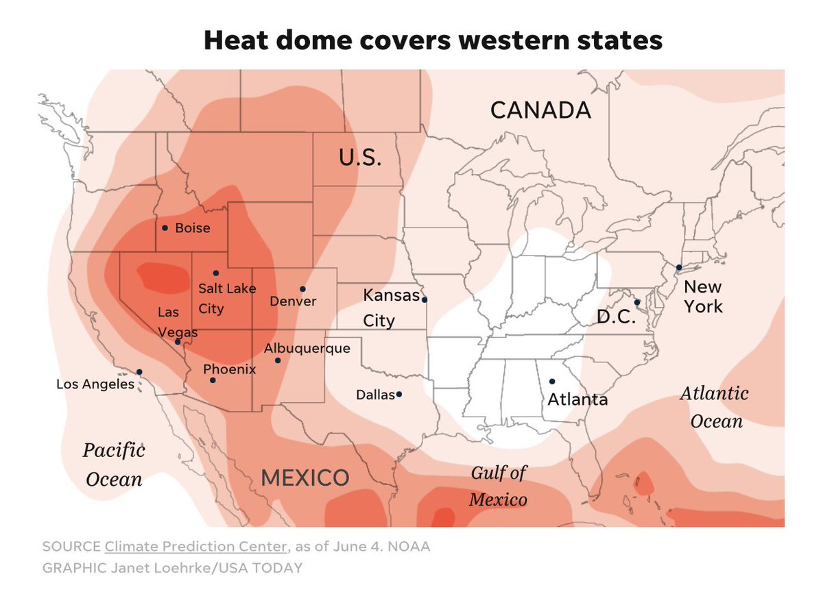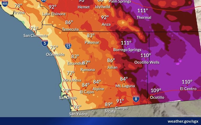 今天美国西部的热浪叫做“热圆顶”。圣地亚哥今天最高气温从海岸的22摄氏度逐渐上升到沙漠的44摄氏度,刚好相差一倍。从最高气温分布可以看出,如果要在圣地亚哥北郡买房,15号州际高速是很好的参考线。 https://t.co/RznYJfKxpE