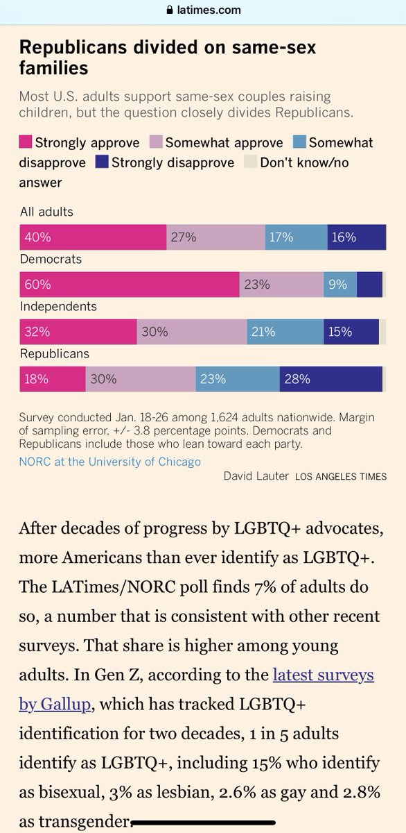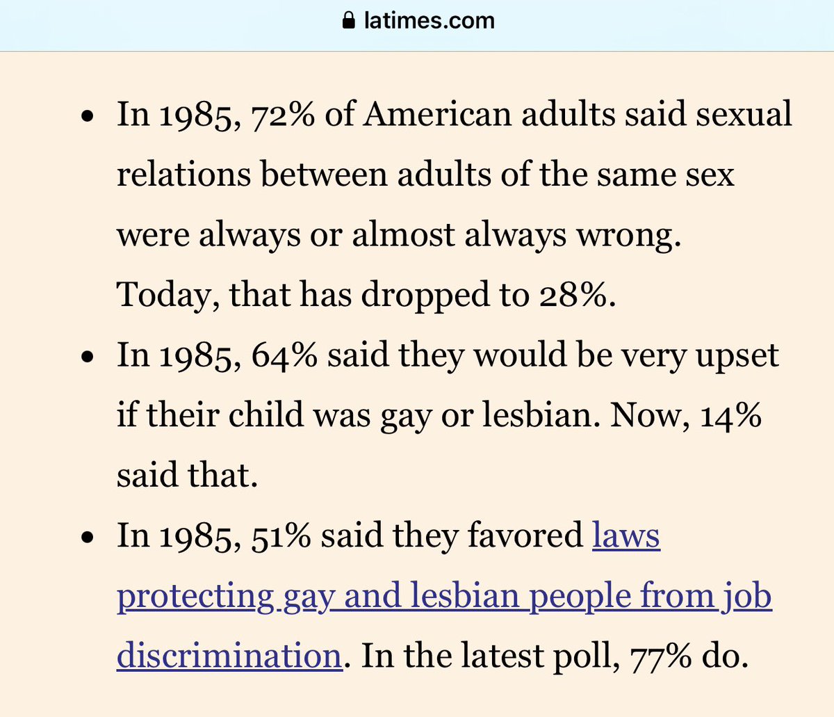 美国的进步:1985年时美国人72%认为同性恋是错的,现在只有28%这么认为。1985年64%美国人会对子女是同性恋感到伤心,现在只有14%这么认为。现在67%美国人赞成同性恋家庭养育子女,包括88%民主党、62%无党派、48%共和党这么认为。 https://t.co/7kt8IcTKfE