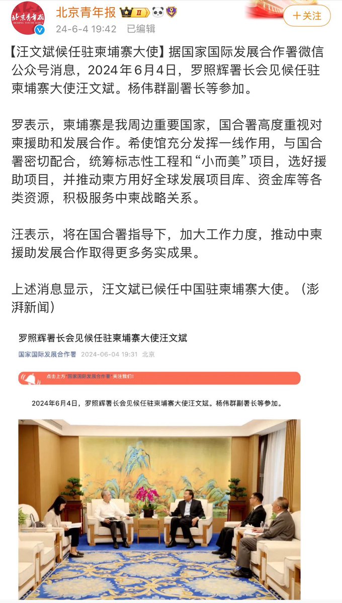 2017年汪文斌已是驻突尼斯大使,过了7年,又回头平调去当驻柬埔寨大使,而同时期华春莹已连升两级从新闻司副司长变成外交部副部长,看来汪文斌还不够蠢。赵立坚够蠢,只是因为一句“偷着乐”惹了众怒,只好把他发配边疆。 https://t.co/DhGgKvNRRA