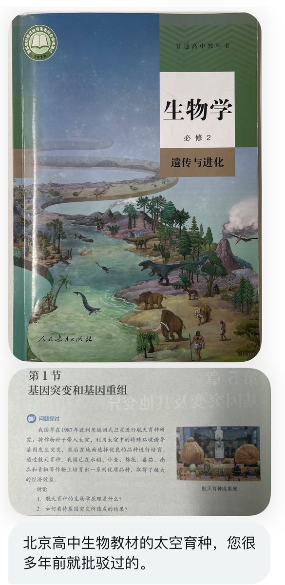 中国高中生物还在学“航天育种”伪科学。基因突变是随机的,而“航空育种”声称太空中的基因突变能增加有利突变,不随机,让学生怎么理解“基因突变”? https://t.co/WEQ4Ismn5j