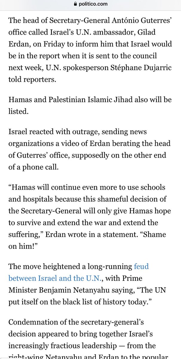联合国秘书长办公室通知以色列,联合国将在下周把以色列和哈马斯都列入从事侵犯儿童权利和保护的战争的黑名单。以色列政府又满地打滚,内塔尼亚胡称,联合国自己就在历史黑名单中。既然如此,以色列还不赶快退出联合国让位给巴勒斯坦?从此把以色列称为恐怖主义国家名正言顺。 https://t.co/YTndPrWA8r