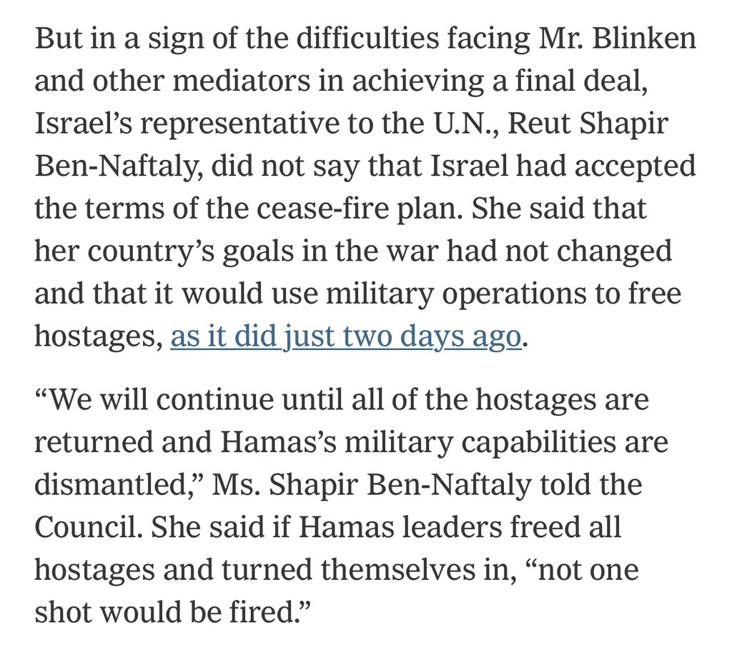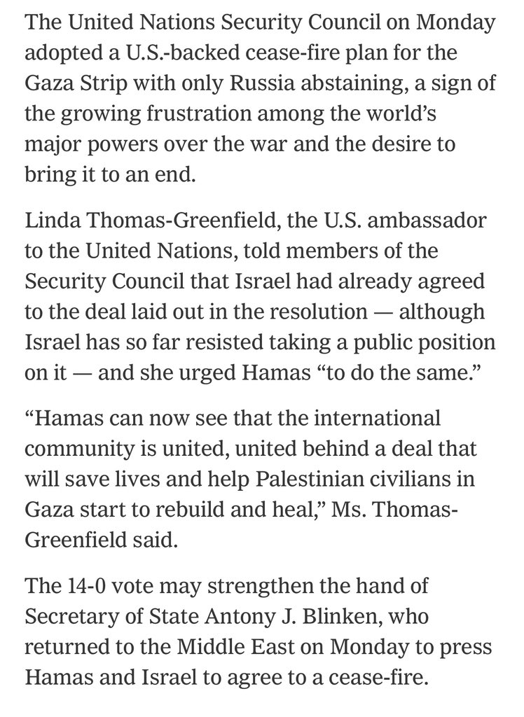 联合国安理会14:0通过美国提出的加沙停火方案,俄国弃权。以色列和哈马斯都没有表示接受该方案,但美国声称这是以色列提出的方案,要求哈马斯接受。以色列代表声称,其目标没变,要实现停火,哈马斯必须释放全部人质并投案自首,按圣人标准要求恐怖分子。 https://t.co/xwC2xLBmfb