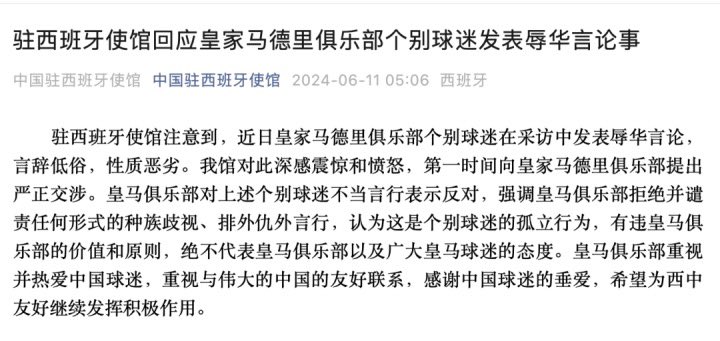 皇马一个球迷的辱华”言论,就让中国驻西班牙大使馆如临大敌。如果美国也这么玻璃心,就要天天抗议中国球迷的反美言论。 https://t.co/KzKZrdnejv
