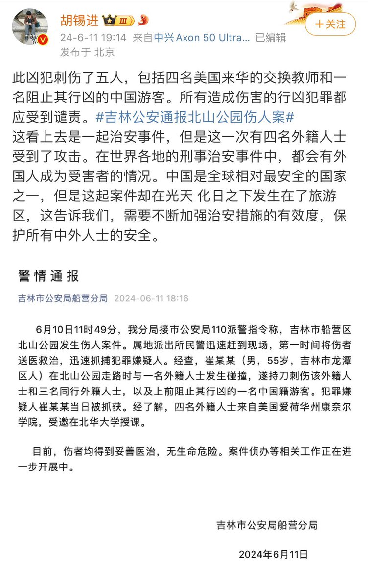 义和团在公园走路与一名老外发生碰撞,就持刀刺伤五人,这种事情哪个国家会有?胡锡进还有脸趁机吹嘘“中国是全球相对最安全的国家之一”,还有哪个国家这么安全?胡锡进的精神祖国俄国吗? https://t.co/VdQdUWuycM