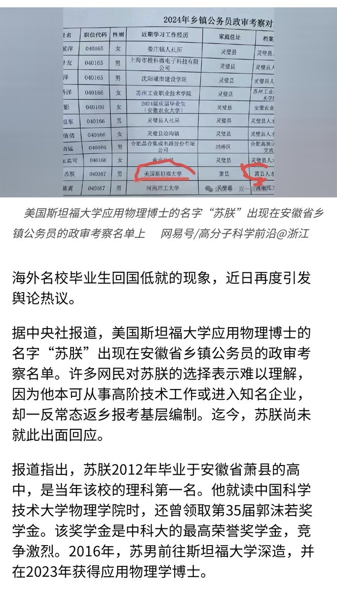 中国科技大学物理学院2016届毕业生苏朕,毕业后就读斯坦福大学应用物理系,和施一公、颜宁一样研究蛋白质晶体结构,2023年获得博士学位,发现这个领域已被人工智能取代,毅然回国到老家安徽萧县报考乡镇公务员。 https://t.co/4pLgnWnMEV