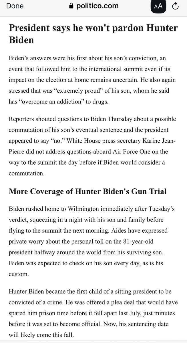 拜登儿子亨特被定罪后,拜登说亨特得到了公正审判,他尊重陪审团的判决,不会赦免亨特。不学川普嚷嚷受到共和党迫害?检察官和法官都是共和党的,法官还是川普任命的。 https://t.co/7hKTQS83y6