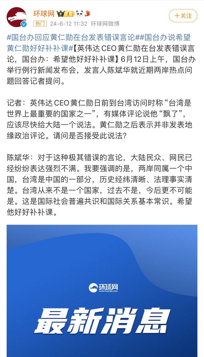 英伟达CEO说台湾是世界上最重要的国家之一,中国战狼只敢轻描淡写地批评他“飘了”,如果换了别人,早被全盘封杀了。可见战狼们势利眼得很。 https://t.co/uCvcOuWSAB