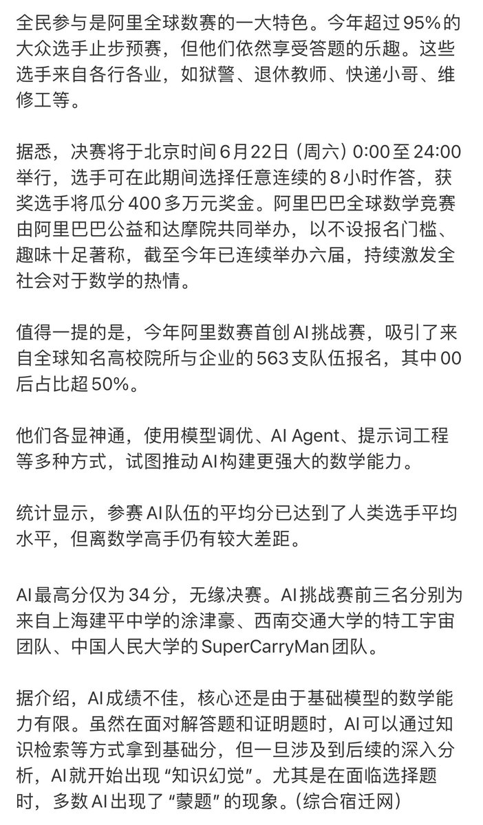 中国媒体在宣传出了一个数学女天才,“17岁中专女生爆冷拿下数学竞赛全球12名”,我还以为是什么数学大赛,原来是阿里巴巴搞的中国人自娱自乐的全民竞赛,跟“全球”有什么关系?即使这个中专生真达到了数学系本科生水平,就叫数学天才了?数学系本科生个个天才?第一名是上海中学生,岂不更是天才? https://t.co/tHvfYtwHud