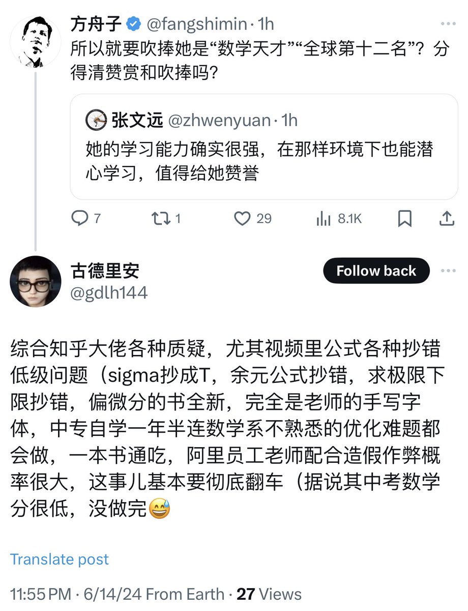 看来这个“中专生数学天才”就是阿里巴巴推出来骗人的,其实她根本就不懂高等数学。和当年新概念作文推出“语文天才”韩寒一个路数,中国人就吃这一套。 https://t.co/80CWNoHxro