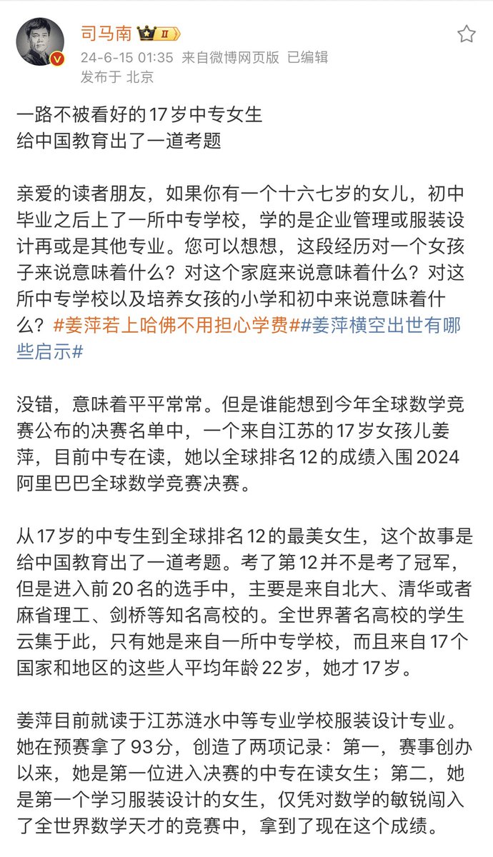 安替也要当数学天才。阿里巴巴炒作一个“中专生数学天才”的效果立竿见影。那个比赛是两天的开卷比赛,能否真比出一个人的数学水平很值得怀疑。上世纪80年代有学习好的初中生为了早日出来赚钱养家去读中专的,现在应该不会有这样的人。数学好必然其他科目特别是理科必然不会差,怎么可能因为偏科去读中专 https://t.co/lqSdIZ0A43