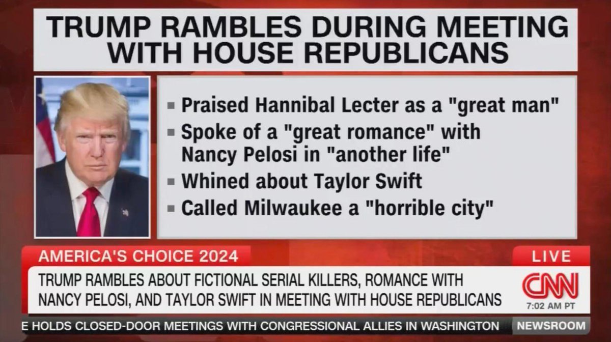 伟大领袖川普在接受共和党议员朝拜时做了这些最高指示:《沉默的羔羊》里的杀人犯汉尼拔是一个伟人,下辈子他会深深爱上佩洛西,抱怨泰勒.斯威夫特,说即将举办共和党全国大会的密尔瓦基是一个糟透了的城市。 https://t.co/AEdJxx97Xa