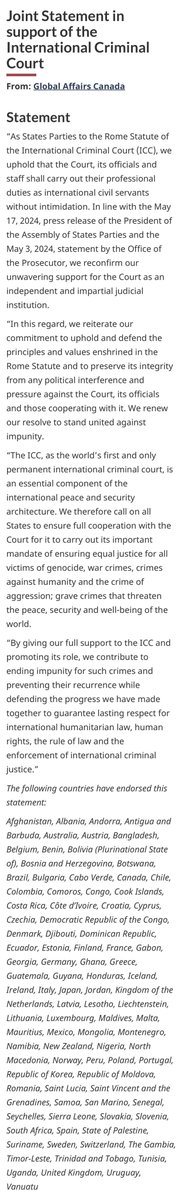 93国联合发表声明支持国际刑事法院不受威胁恐吓地办案,签署者一大堆美国的盟国,真不给美国面子。签署的国家:阿富汗、阿尔巴尼亚、安道尔、安提瓜和巴布达、澳大利亚、奥地利、孟加拉国、比利时、贝宁、玻利维亚多民族国、波斯尼亚和黑塞哥维那、博茨瓦纳、巴西、保加利亚、佛得角、加拿大、智利、哥伦比亚、科摩罗、刚果、库克群岛、哥斯达黎加、科特迪瓦、克罗地亚、塞浦路斯、捷克、刚果民主共和国、丹麦、吉布提、多米尼加共和国、厄瓜多尔、爱沙尼亚、芬兰、法国、加蓬、格鲁吉亚、德国、加纳、希腊、危地马拉、圭亚那、洪都拉斯、冰岛、爱尔兰、意大利、日本、约旦、荷兰王国、拉脱维亚、莱索托、列支敦士登、立陶宛、卢森堡、马尔代夫、马耳他、毛里求斯、墨西哥、蒙古、黑山、纳米比亚、新西兰、尼日利亚、北马其顿、挪威、秘鲁、波兰、葡萄牙、大韩民国、摩尔多瓦共和国、罗马尼亚、卢西亚、圣文森特和格林纳丁斯、萨摩亚、圣马力诺、塞内加尔、塞舌尔、塞拉利昂、斯洛伐克、斯洛文尼亚、南非、西班牙、巴勒斯坦国、苏里南、瑞典、瑞士、冈比亚、东帝汶、特立尼达和多巴哥、突尼斯、乌干达、英国、乌拉圭、瓦努阿图