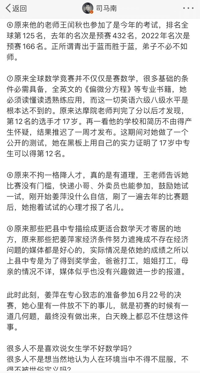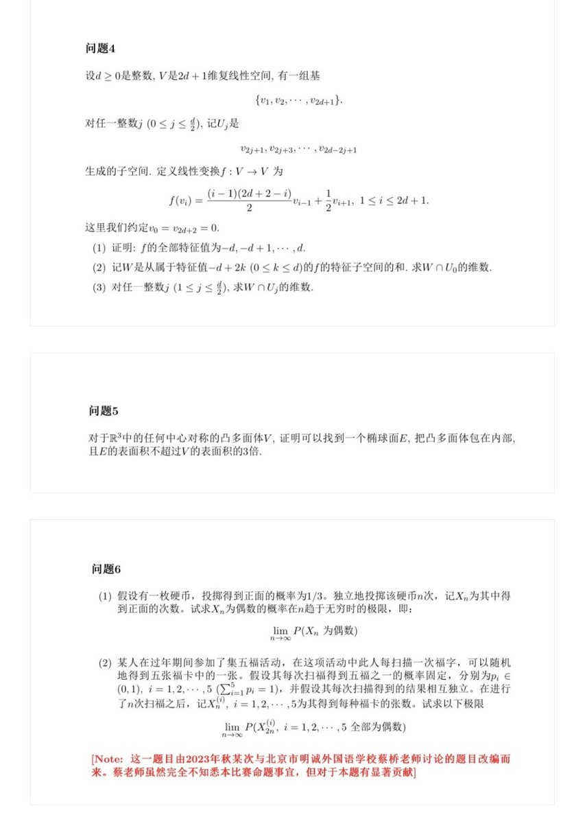 入围“阿里巴巴全球数学竞赛决赛”的还有一个初中生。神州大地遍地天才。大家看看比赛题目,看看中专生、初中生有没有可能看得懂,抄都会抄错的。这些题目包括概率、几何、线性代数,并不在姜萍声称自学过的那三本书的范围,她还得多报书名。这些题目也都没用到偏微分方程。她为什么要吹自己会偏微分方程?觉得听上去很吓人?