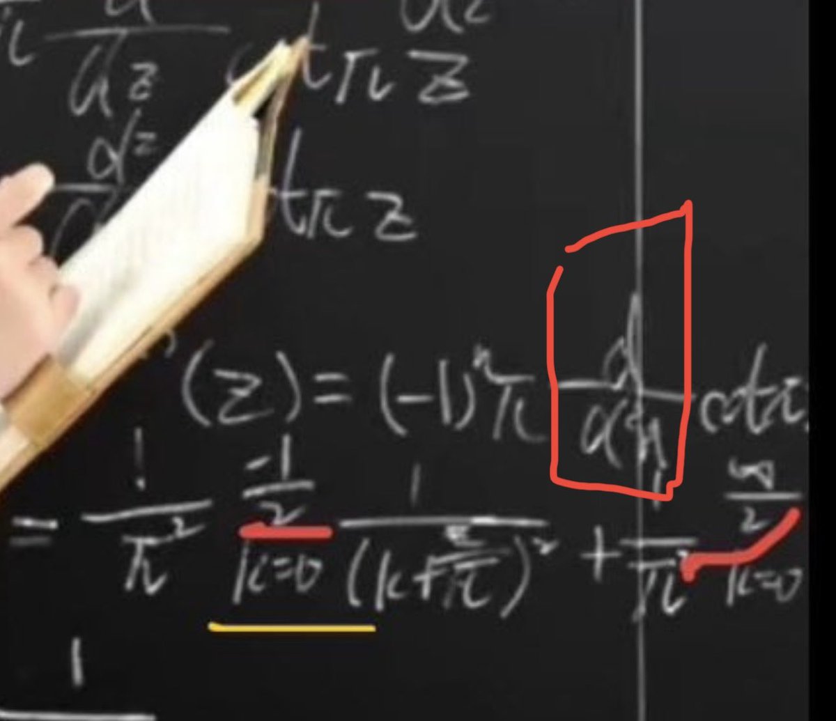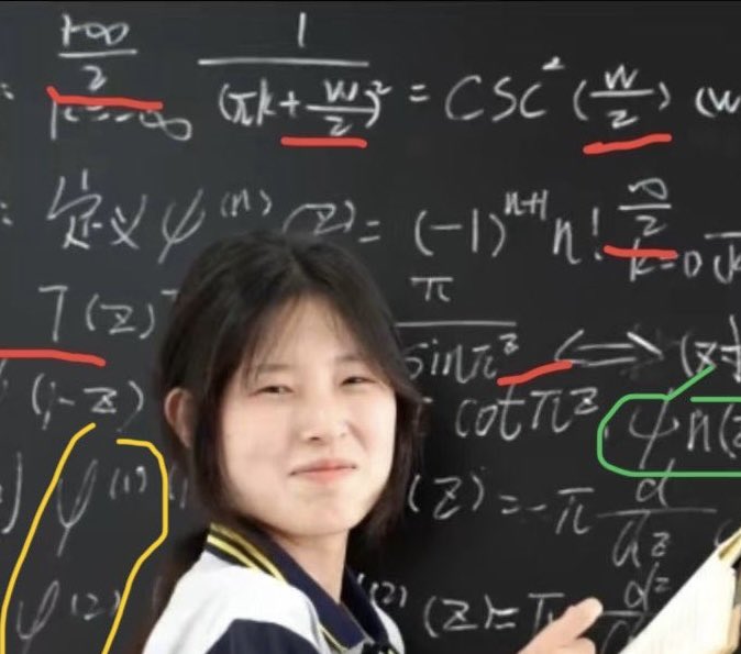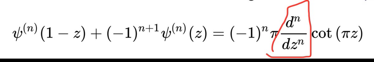 又新发现的一处抄写错误也能表明“中专数学天才”完全不懂高等数学。这里她要抄的是多伽马函数的反射公式,却把d^n/dz^n抄成了d/d^zn,漏了一个上标n,又把z和n上标对掉,对数学公式完全无感,不知道自己在写什么。 https://t.co/tRkcaYlPby
