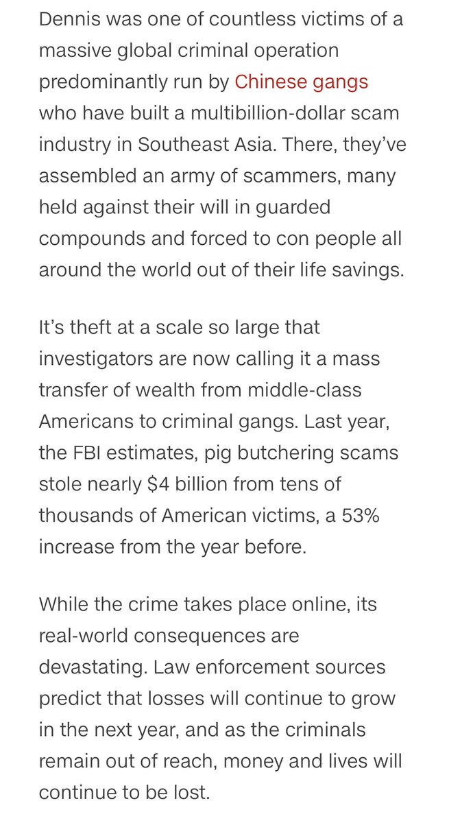 去年中国“杀猪盘”骗走美国人近40亿美元,比前年增加53%,这算是经济弯道超车。 https://t.co/JiHgLTJNrG