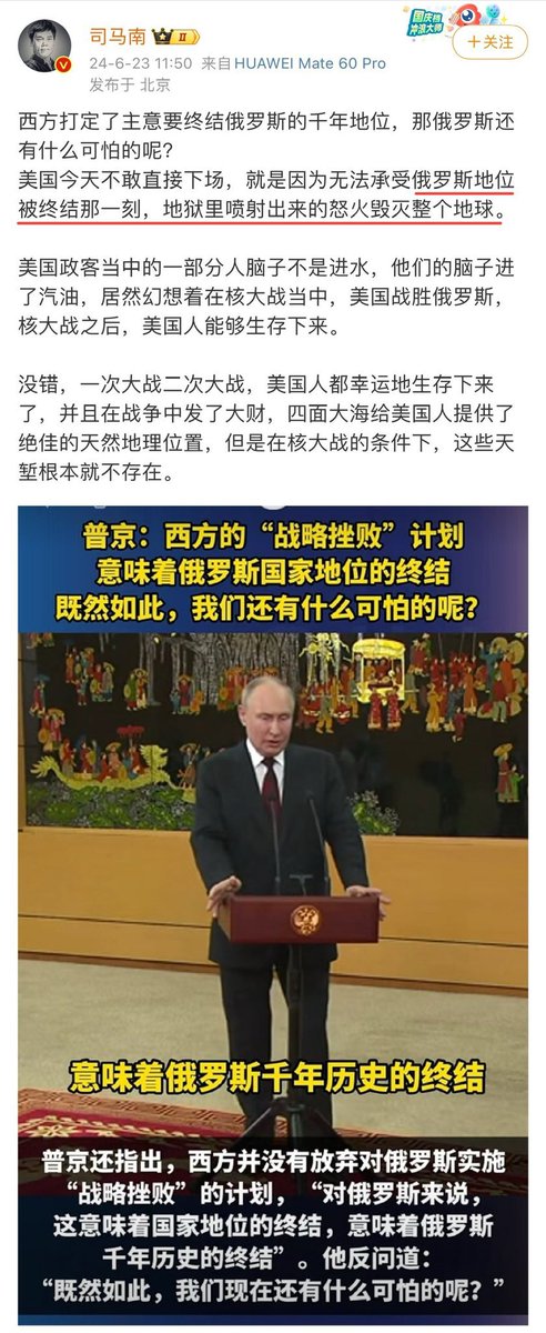 司马南和胡锡进殊途同归,都在支持俄国打核战争,如果俄国不能保住历史地位,就要全世界给他们的精神祖国陪葬。对司马南、胡锡进来说,俄国的国家利益是至高无上的,超过人类利益,更不要说中国利益。叫嚣打核战争的疯子都是反人类的全人类公敌。 https://t.co/RTwk4ampXu