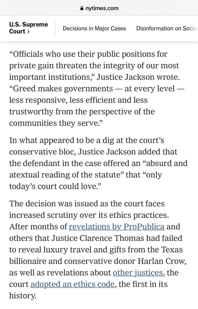 美国最高法院6:3判决官员收取感谢金不是腐败。2013年印第安纳州一个市花110万美元买了5辆垃圾车,第二年垃圾车公司给了市长$13000的“咨询费”表示感谢,后来该市长被联邦法院判刑1年。今天最高法院6名保守派大法官判决,官员事后收取感谢金不算联邦法律规定的腐败,改判无罪。保守派大法官自己就喜欢收礼,要让美国社会变腐败。杰克逊大法官在异议里指出,只有今天的最高法院才会做出如此荒唐的判决。