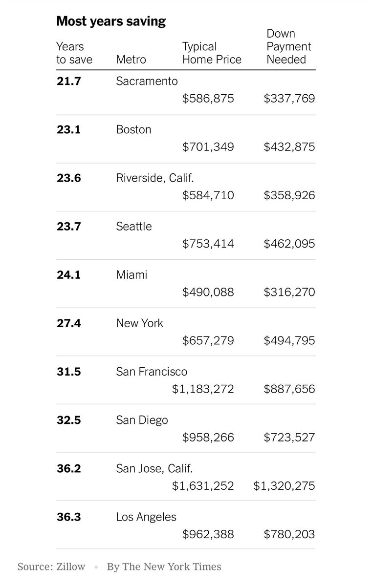 付房贷首付需要的储蓄时间,全美为12年,洛杉矶:36.3年,圣何塞:36.2,圣地亚哥:32.5,旧金山:31.5,纽约:27.4,迈阿密:24.1,西雅图:23.7,河滨:23.6,波士顿:23.1,萨卡拉门托:21.7。匹兹堡:0,圣路易斯:1.2,伯明翰:2.4,底特律:2.8,印第安纳波利斯:3.1,俄克拉荷马市:3.9,克利夫兰:4.0,孟菲斯:4.1,路易斯维尔:5.7,新奥尔良:6.1。