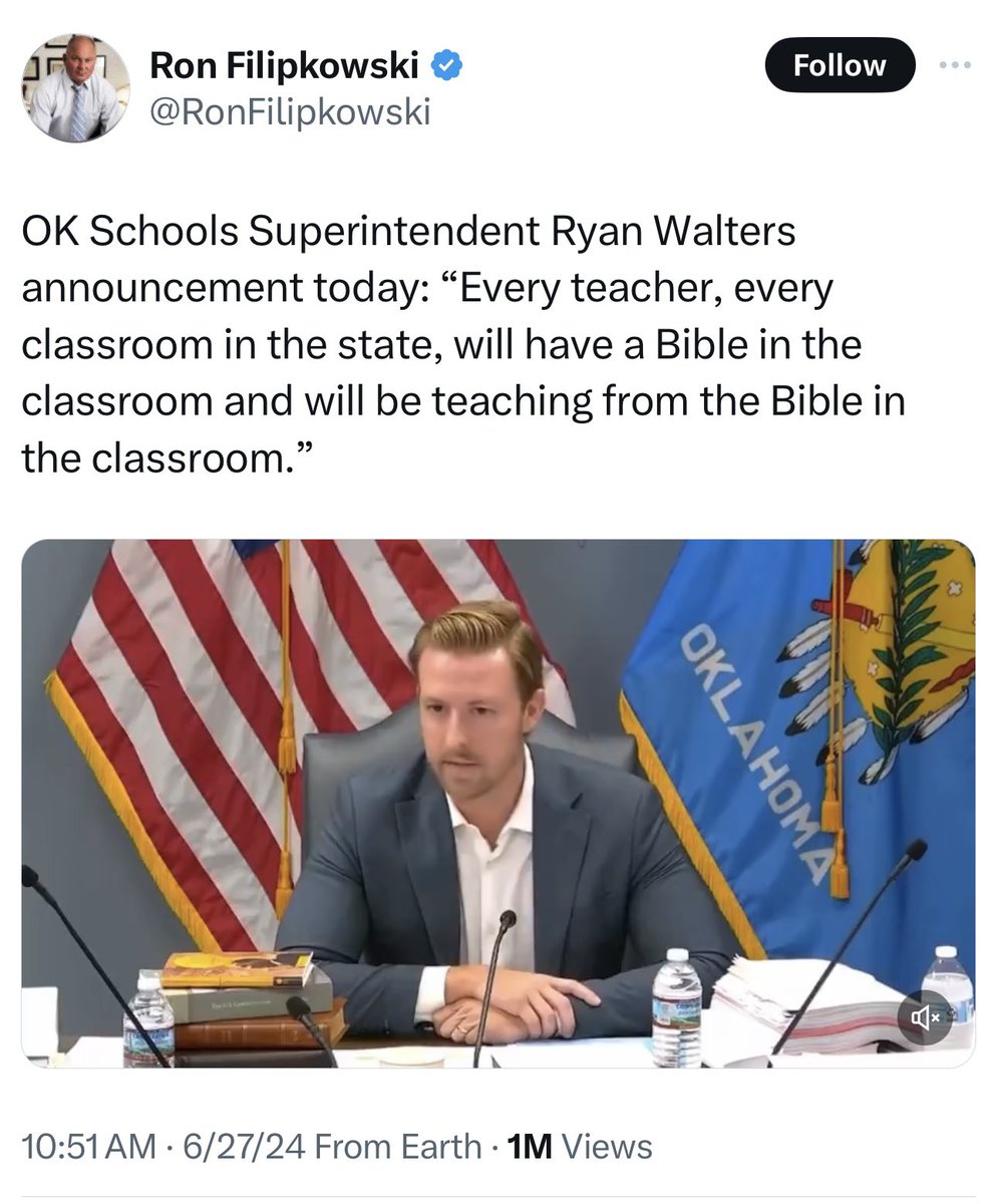 俄克拉荷马走向中世纪:俄克拉荷马州教育总管宣布,该州每个教室都要放基督教《圣经》,都要教基督教《圣经》。 https://t.co/ycx6fyqzGO