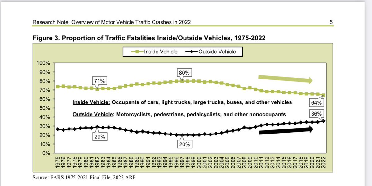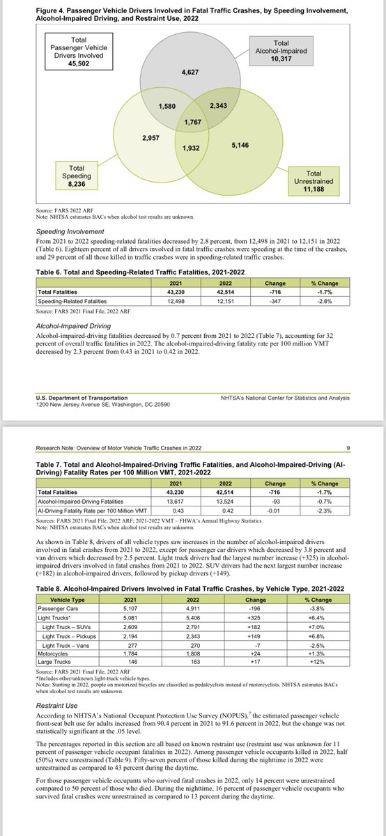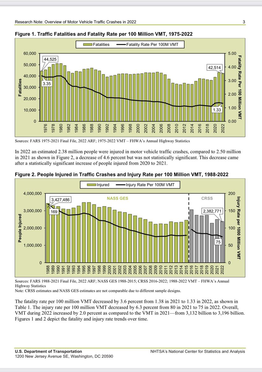 2022年美国有42514人死于车祸,死亡率每1亿英里1.33;2,382,771人在车祸受伤,受伤率每1亿英里75。因车祸死亡案例64%发生于车内,50%未系安全带,32%涉及酒驾,29%超速。 https://t.co/pqSWW9VDez