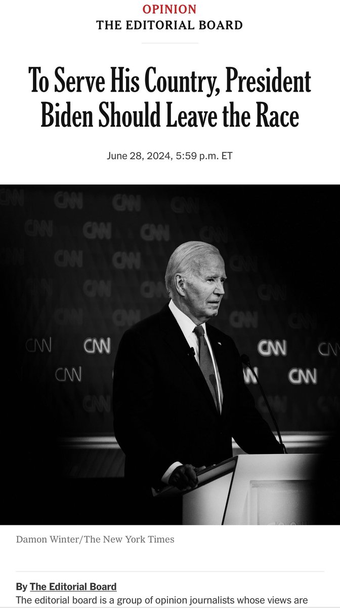 《纽约时报》发社论建议拜登退选,以确保川普不会卷土重来。人越老越固执、自信,拜登应该不会听。民主党随便派一个候选人出来都能躺赢,却逼着美国选民在一个精力衰退的老人和一个满嘴谎言的重罪犯之间做选择。 https://t.co/3BylPb3KTK