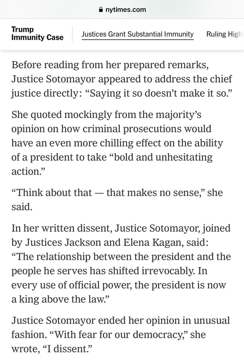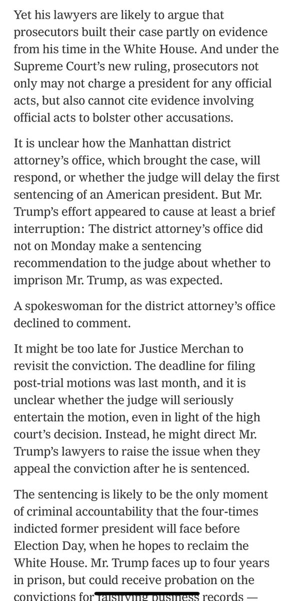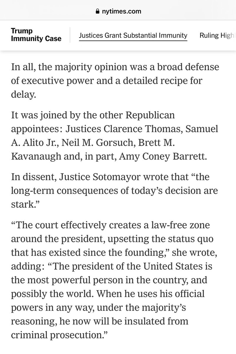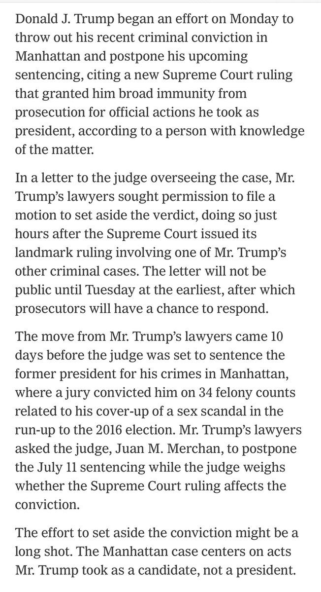今天美国最高法院判决一下来,川普立即提出动议,要求主持风暴姐封口费案的法官改判他无罪,理由是他给风暴姐封口费的时候虽然不是总统,但是他做假账的时候已经是总统,根据最高法院判决,他当总统时做假账享有司法豁免权,不能被追究。保守派大法官们让美国法治成了笑话。 https://t.co/921LZVg0Xi