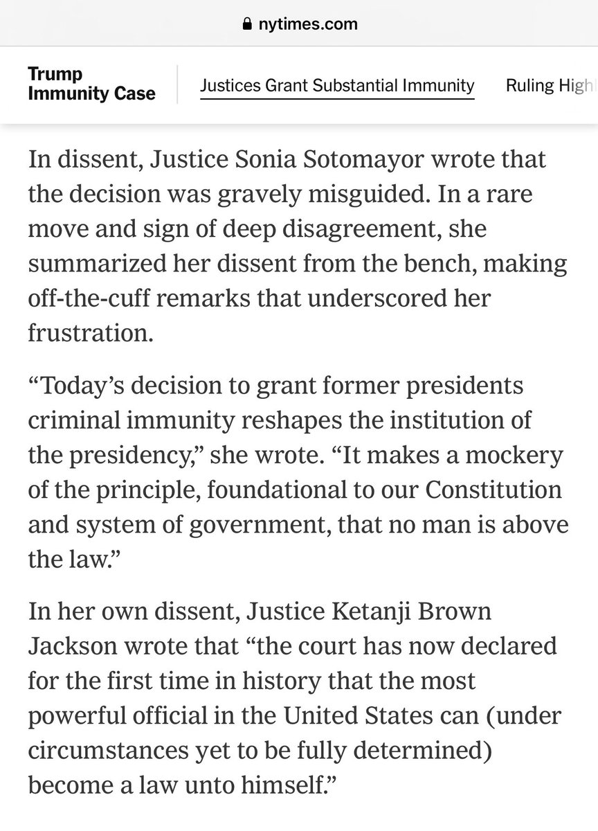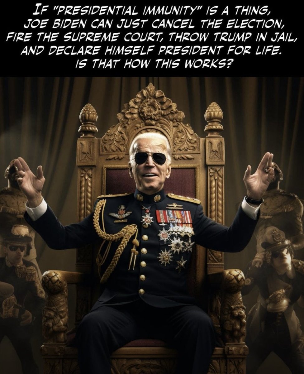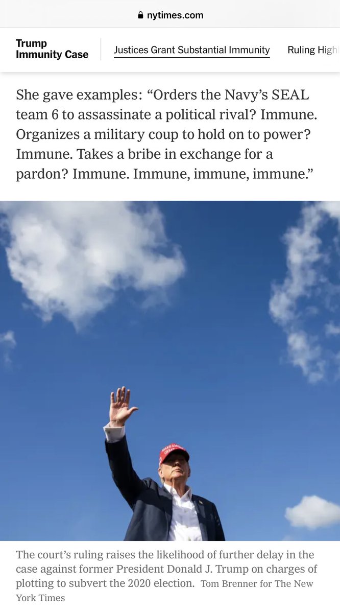 美国最高法院保守派大法官为川普保驾护航,6:3判决总统如果行使职权,不管干什么都要假定有司法豁免权。所以像川普的律师声称的,如果川普命令海豹突击队刺杀政治对手,也要假定他有司法豁免权。如果川普再次上台,他就可以把自己当成凌驾于法律之上的国王了。保守派大法官声称该判决不是为了维护川普,而是适用于所有总统,不过他们吃准了民主党的总统要脸面。拜登说了,他谴责该判决,不会因此就滥用职权,否则岂不就可以下令刺杀川普。
